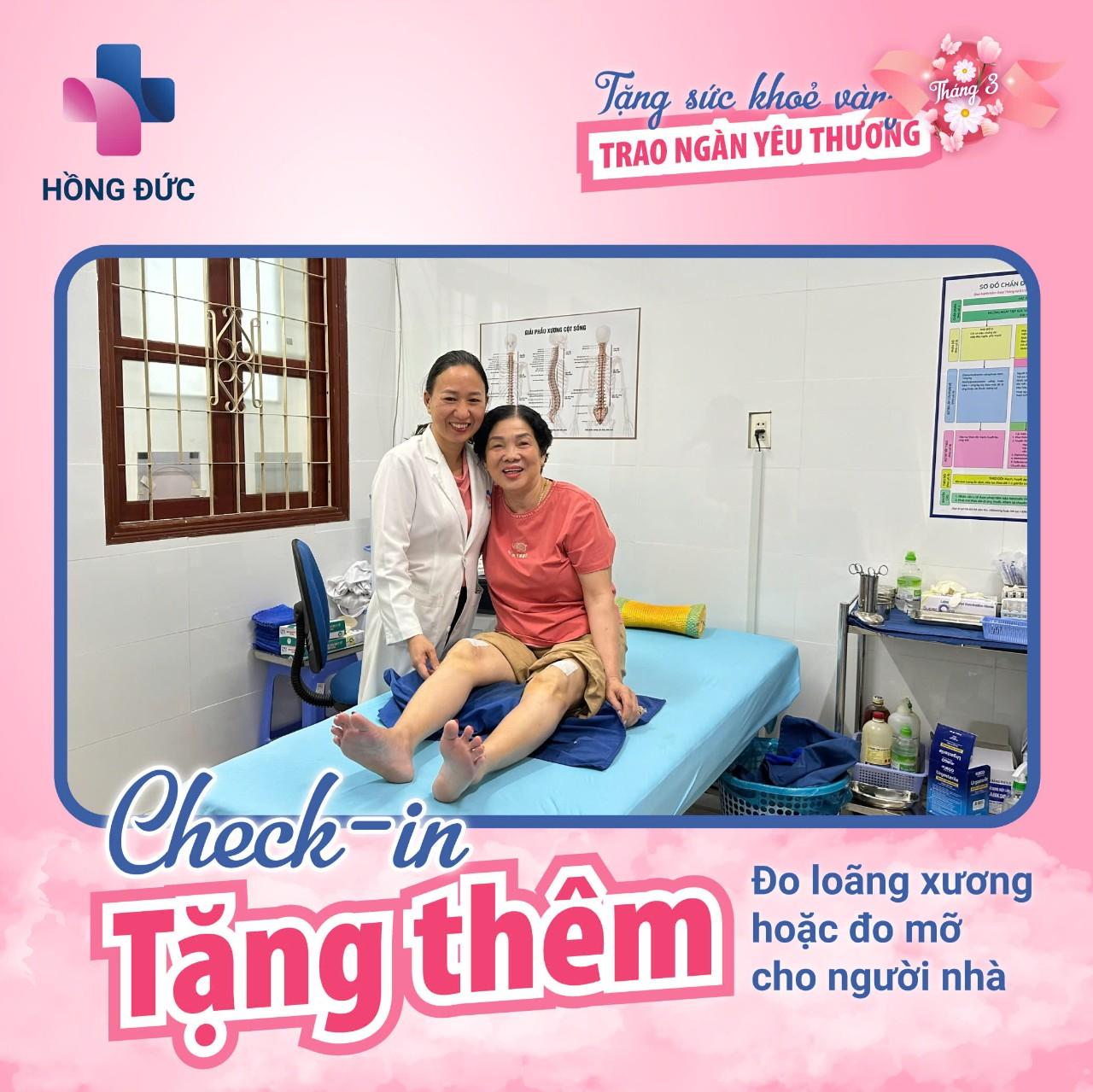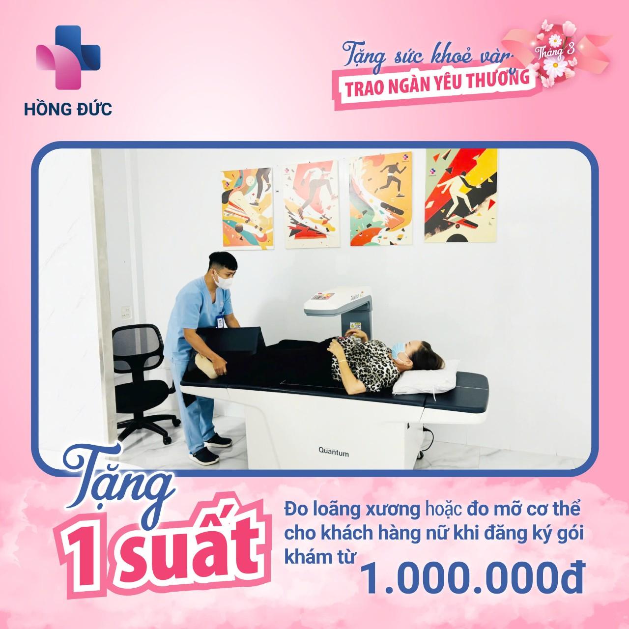 ✅ Tặng thêm 1 suất đo loãng xương hoặc đo mỡ cho người nhà khi khách hàng nữ đăng ký gói khám từ 1 triệu đồng trở lên và check-in tại PKĐK Hồng Đức (chụp ảnh, đăng Facebook/Zalo cá nhân kèm hashtag #khoedepcunghongduc)