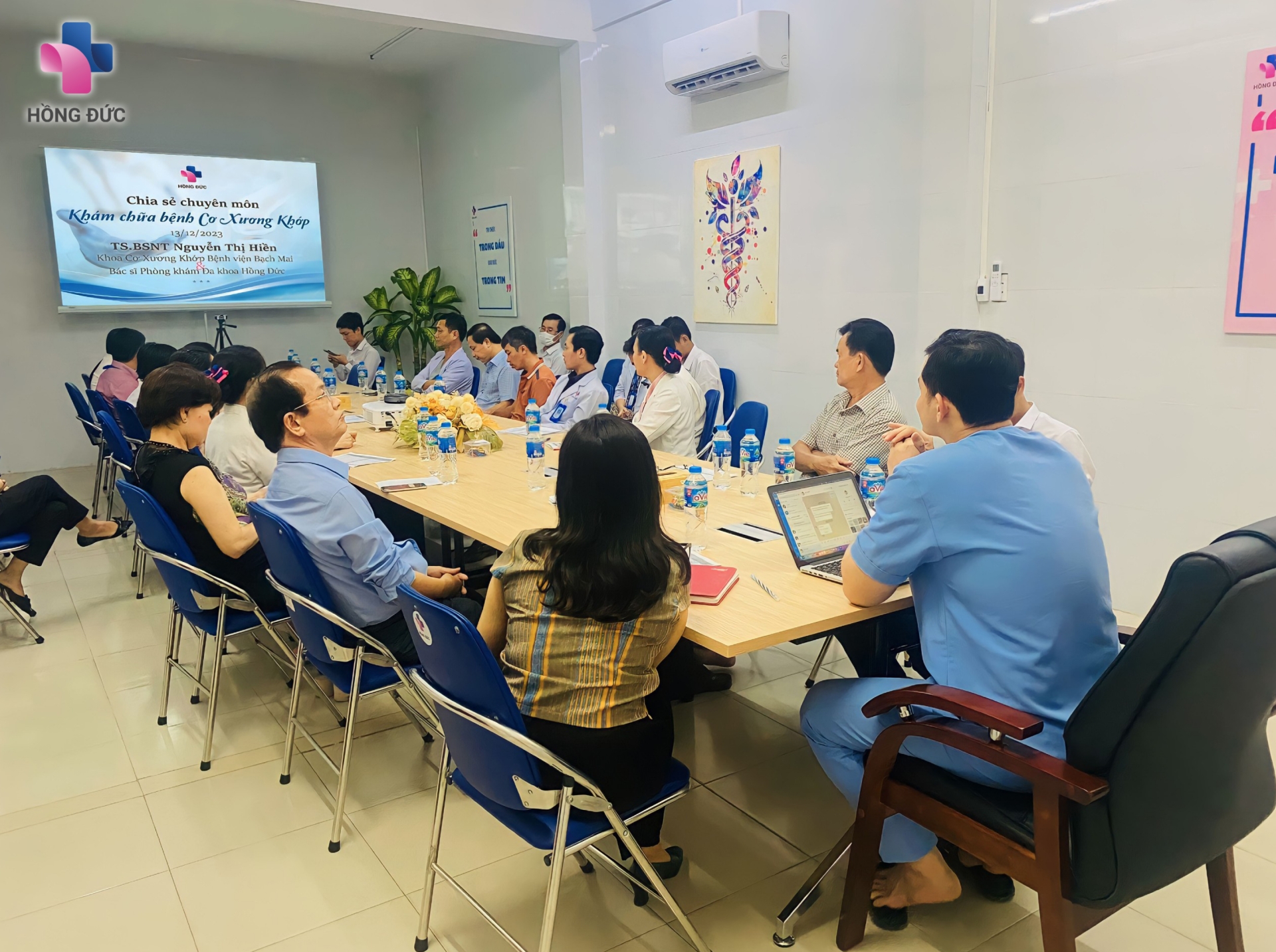 Không chỉ chia sẻ các kiến thức, kinh nghiệm và định hướng trong lĩnh vực chuyên môn khám chữa bệnh Cơ Xương Khớp, TS.BSNT Nguyễn Thị Hiền và đội ngũ y bác sĩ phòng khám Đa khoa Hồng Đức cũng đã trao đổi và cùng nhau thảo luận sôi nổi về những vấn đề phổ biến trong công tác điều trị. Từ đó, hướng đến mục tiêu chung nhằm cung cấp dịch vụ y tế an toàn, chất lượng của PKĐK Hồng Đức.