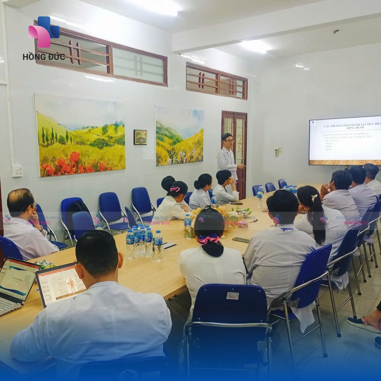 Không chỉ khám chữa bệnh, BS Phùng Đức Tâm còn có những bài giảng đào tạo và chia sẻ chuyên môn cho đội ngũ y bác sĩ PKĐK Hồng Đức để tiếp cận những phương pháp điều trị CXK tiên tiến và hiện đại. Đặc biệt, khoa CXK của PKĐK Hồng Đức đã được hỗ trợ nâng cao thêm các kỹ thuật tiêm khớp dưới sự hướng dẫn của siêu âm như tiêm nong khớp vai, tiêm ngoài màng cứng, tiêm khớp liên mấu…